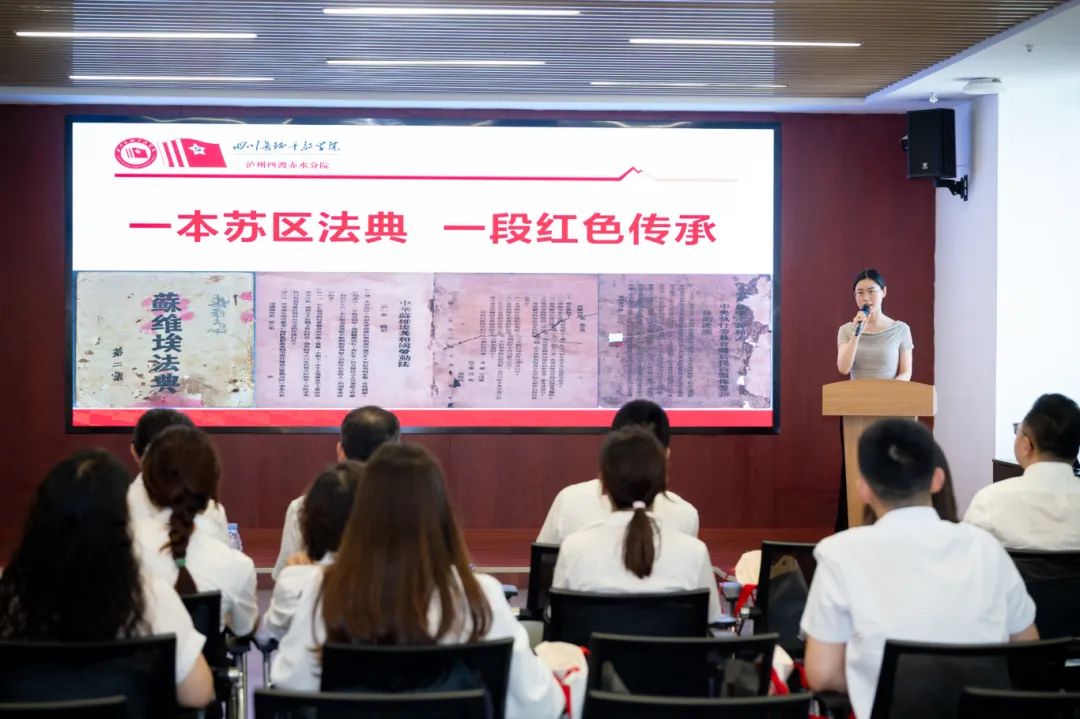 活动带班老师刘霞在致辞中介绍了泸州及泸州四渡赤水分学院概况,并对特锐德川开电气党员代表队伍的到来表示了欢迎,预祝本次活动圆满成功。同时,学院三位主讲老师分别带来了《中华苏维埃共和国苏维埃法典》、《朱德——革命意志坚如钢》、《寻找老班长》的生动分享。