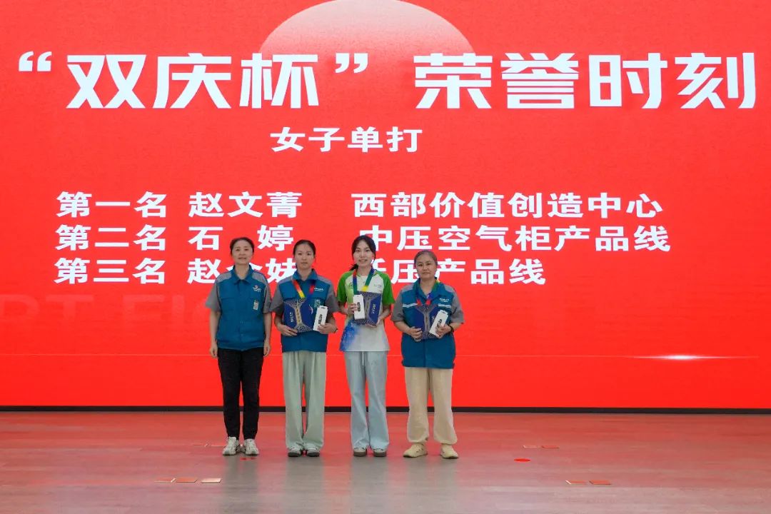 活动前,中共川开电气有限公司委员会第一支部与爱乒才会赢联盟、长埂社区强势联手,共同开展了“双庆杯”乒乓球比赛,以燃情赛事庆贺建军98周年及公司45周年。男单、女单、混双三大竞技战场精彩纷呈,参赛选手各施绝技,沉着发球、大力扣杀、顽强防守,展现出了高超的球技和拼搏精神,也在运动交流中拉进了社企距离。热血挥拍,荣光加载,比赛颁奖仪式在活动会议上正式举行,依次为三场赛事的冠亚季军进行了颁奖。