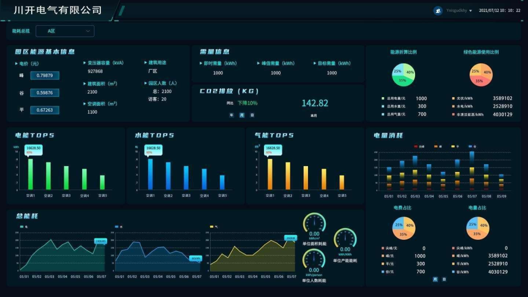 川开电气持续打造绿色环保、节能高效的低碳型能源体系建设。川开电气开发了零碳园区智慧能源管理系统,系统获评“工信部第二批光伏试点示范名单”,以数字化智能配电为基础,开创性地集成“源、网、荷、储、车”等清洁电能和水、气、压缩空气等多能源类型,打造微电网(群)和配电网相互支撑、汽车充放电网与电网深度融合、建筑光伏规模化应用、分布式储能遍布配电网络、海量微型传感器的智能主动运维、人工智能深度协同调度、智能配电支撑智慧交通、多种冷热设备配合供能,实现绿色低碳、智慧高效的工业、产业、科技园区,并通过智慧能源管理平台的全面综合监控、优化调度与智能运维,实现对园区内多种能源及用能设备的综合管理,确保园区内清洁能源的高效利用并降低单位能源消耗。