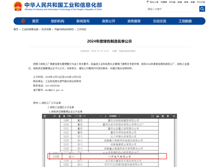2024年12月,国家工业和信息化部公示了《2024年度国家级绿色制造名单》,川开电气名列其中,荣膺“2024年度国家级绿色工厂”称号,成为绿色制造与可持续发展领域中的示范典型。作为输配电装备制造领域的先行者,川开电气以绿色电力设备制造为中心,在可持续绿色发展道路上行稳致远,业务涵盖光伏、储能、绿色低碳服务、节能环保及资源循环利用等多领域,将节能减排、绿色低碳的目标贯穿于原料选择、产品研发、生产制造全流程。
