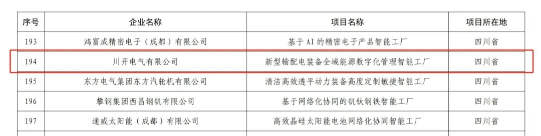 过去几年川开电气获得的荣誉奖项有:国家级高新技术企业、国家火炬计划项目企业、国家级绿色工厂、全国质量标杆、国家知识产权优势企业、全国实施卓越绩效模式先进企业、成渝地区智能制造和工业互联网资源池企业、四川省工业质量标杆、四川省数字化转型促进中心、物联网赋能行业发展典型案例、四川省制造业“贡嘎培优”100户企业、四川企业技术创新发展能力100强、四川省制造业企业100强、四川省先进企业、四川省名牌产品企业、四川省质量稳定标杆企业、四川省服务型制造业企业、四川省诚信示范企业、四川省卓越绩效模式先进企业、四川省工业互联网“双十强”、成都市智能工厂。示范产品:首个取得国家级核级中低压成套鉴定设备、国家重点新产品认证、工信部智能制造试点示范项目、工信部智能光伏试点示范项目、四川省名优产品、四川省工业互联网示范项目。
