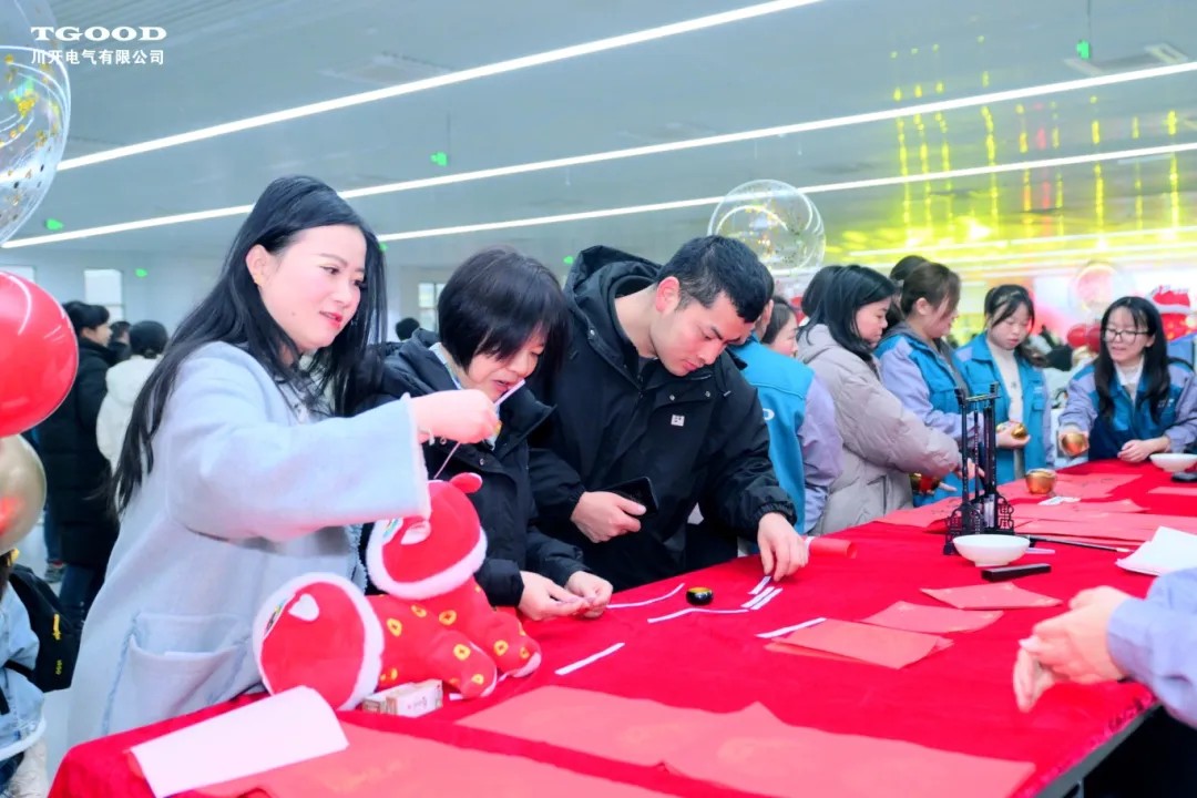 团拜会前,“财神”向战友们送出“金元宝”糖罐,传递好运和福气。川开电气有限公司党委副书记、工会主席杨莉携专业书法老师在签到处挥毫泼墨,为战友们送上充满墨香的祝福。翰墨飘香,气氛热烈,一副副寓意深刻的春联、一张张喜气洋洋的“福”字跃然纸上,战友们也怀揣着浓浓“年味”纷至沓来。