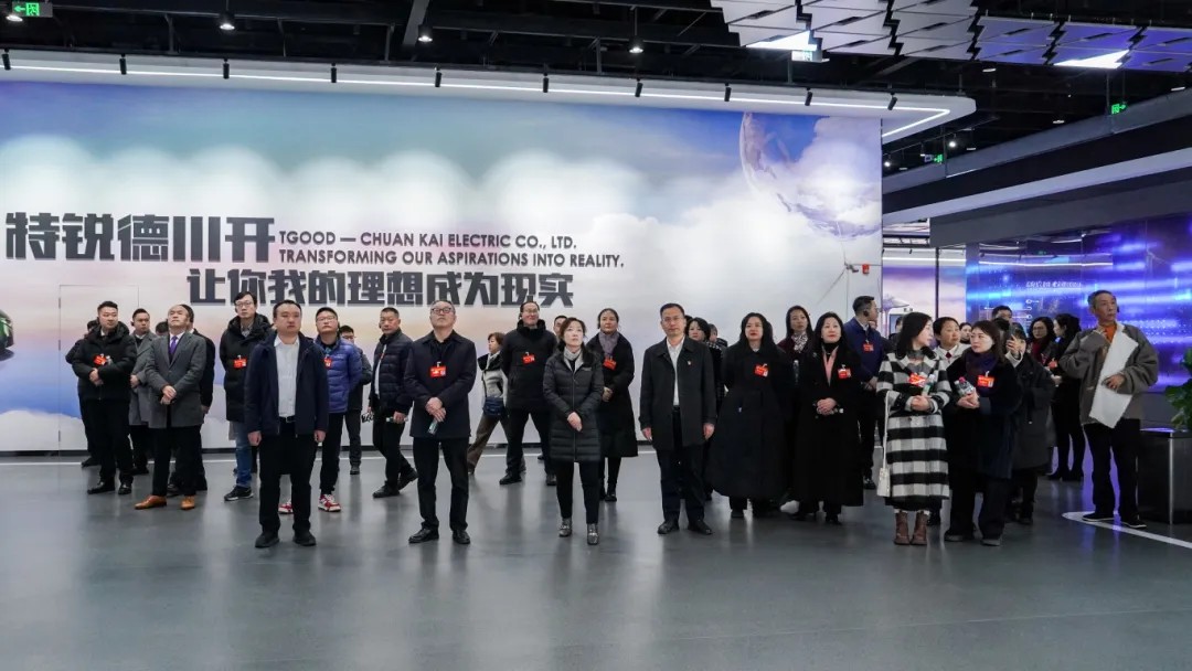 1月7日,双流区政协党组书记、主席唐劲松率区政协十二届五次全会委员一行莅临特锐德川开电气视察调研,区政协副主席朱峰、韦瑜、杜贤文陪同视察。特锐德川开电气党委书记、副董事长邢志刚,总经理杨杰等公司领导热情接待了调研组一行。