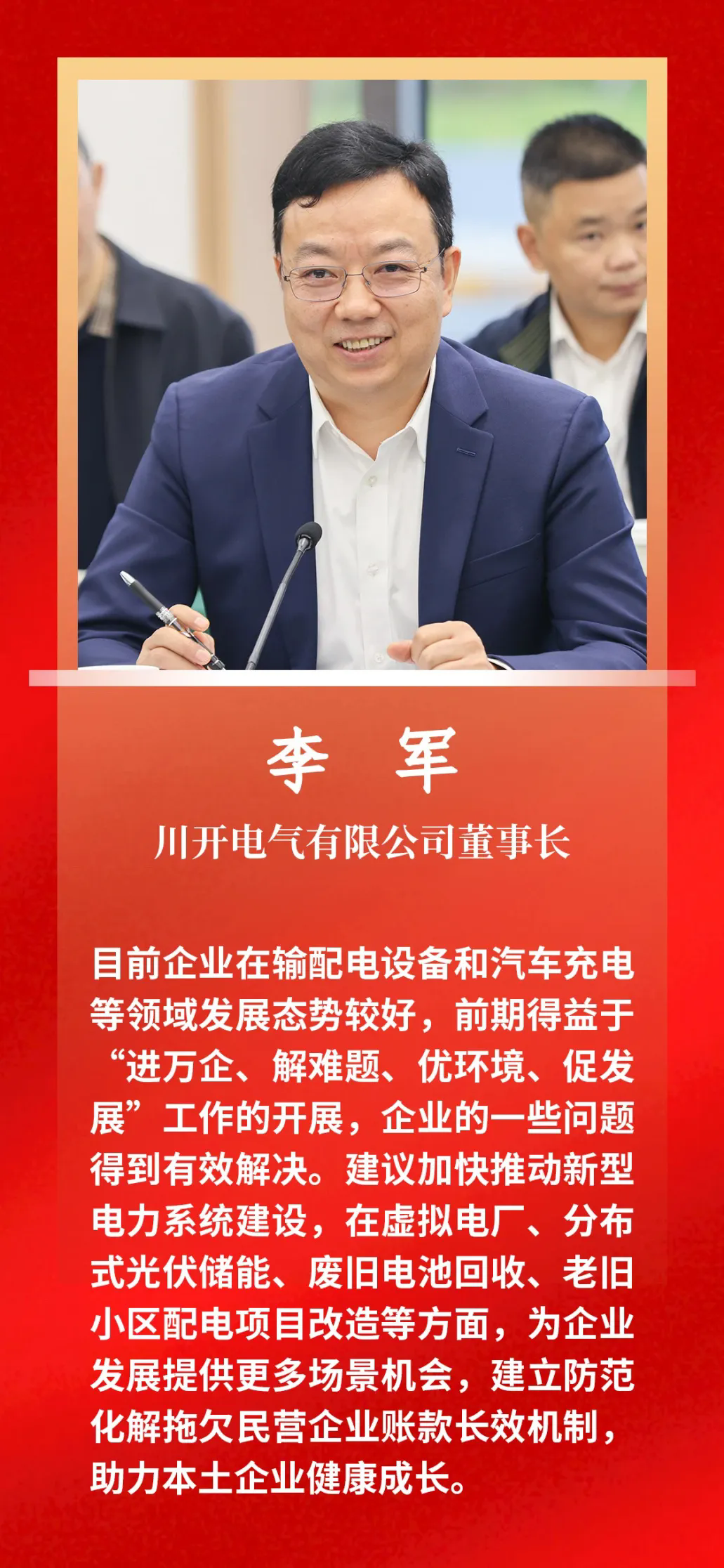 座谈会上,特锐德川开电气等18家民营企业代表先后发言,介绍了企业发展情况,围绕科技创新、产业转型、人才引育、营商环境、要素保障等提出了意见建议。特锐德川开电气董事长李军在会议发言时表示,目前公司在输配电设备和汽车充电等领域发展态势较好,前期得益于进万企、解难题、优环境、促发展”工作的开展,企业的一些问题得到有效解决。同时,建议加快推动新型电力系统建设,在虚拟电厂、分布式光伏储能、废旧电池回收、老旧小区配电项目改造等方面,为企业发展提供更多场景机会,建立防范化解拖欠民营企业账款长效机制,助力本土企业健康成长。