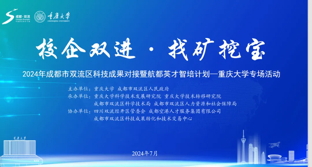 为贯彻落实区委十四届八次全会精神,推进成渝地区双城经济圈建设,7月17日,由重庆大学、成都市双流区人民政府主办,重庆大学科学技术发展研究院、重庆大学技术转移研究院、成都市双流区科学技术局、成都市双流区人力资源和社会保障局承办的“校企双进·找矿挖宝”2024年成都市双流区科技成果对接暨航都英才智培计划——重庆大学专场活动成功举办。