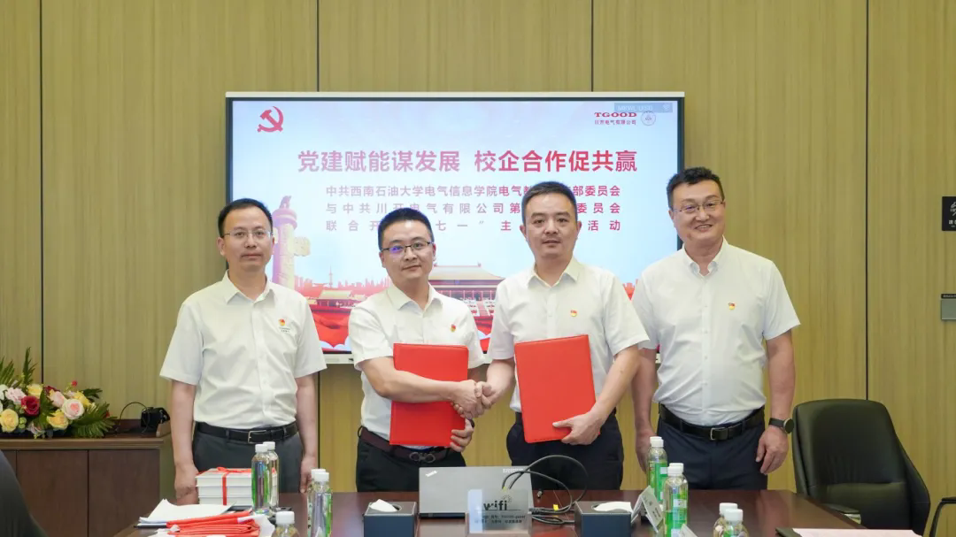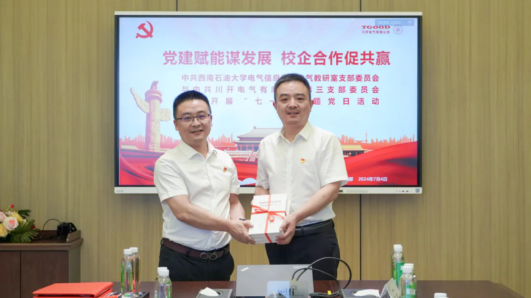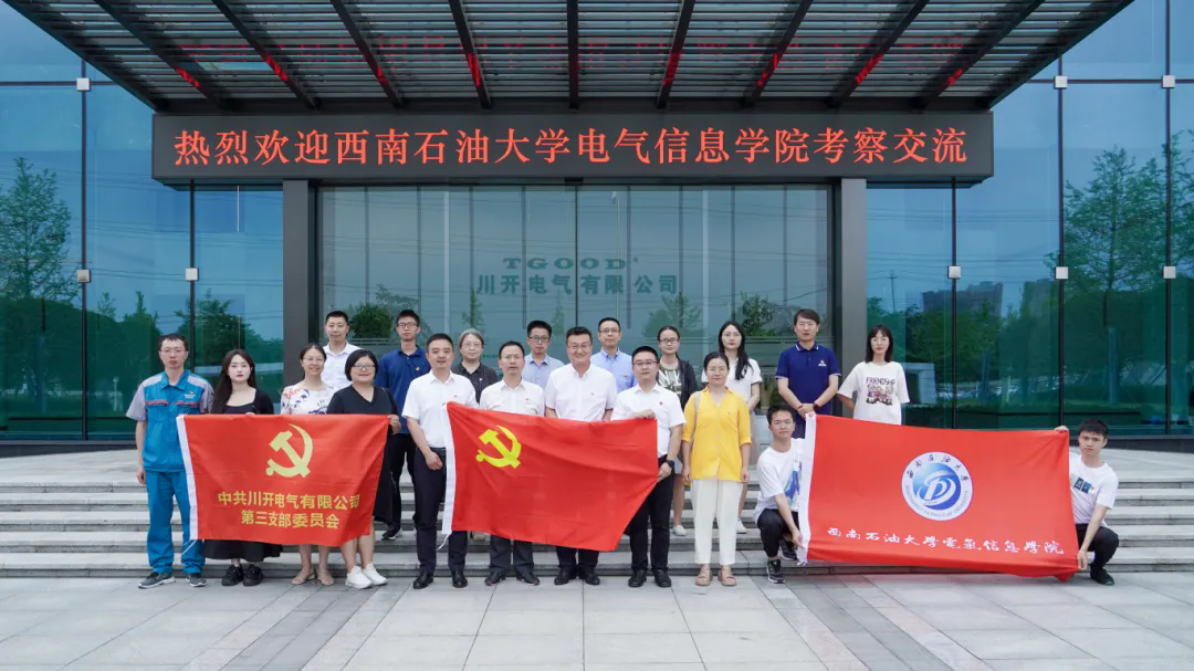 7月4日,中共西南石油大学电气教工党支部委员会与中共川开电气有限公司第三支部委员会联合开展“七一”主题党日活动。西南石油大学电气信息学院党委书记、研究员李忠伟等西南石油大学电气信息学院领导及师生,特锐德川开电气党委书记、副董事长邢志刚等公司领导及中共川开电气有限公司第三支部委员会委员参加了本次活动。