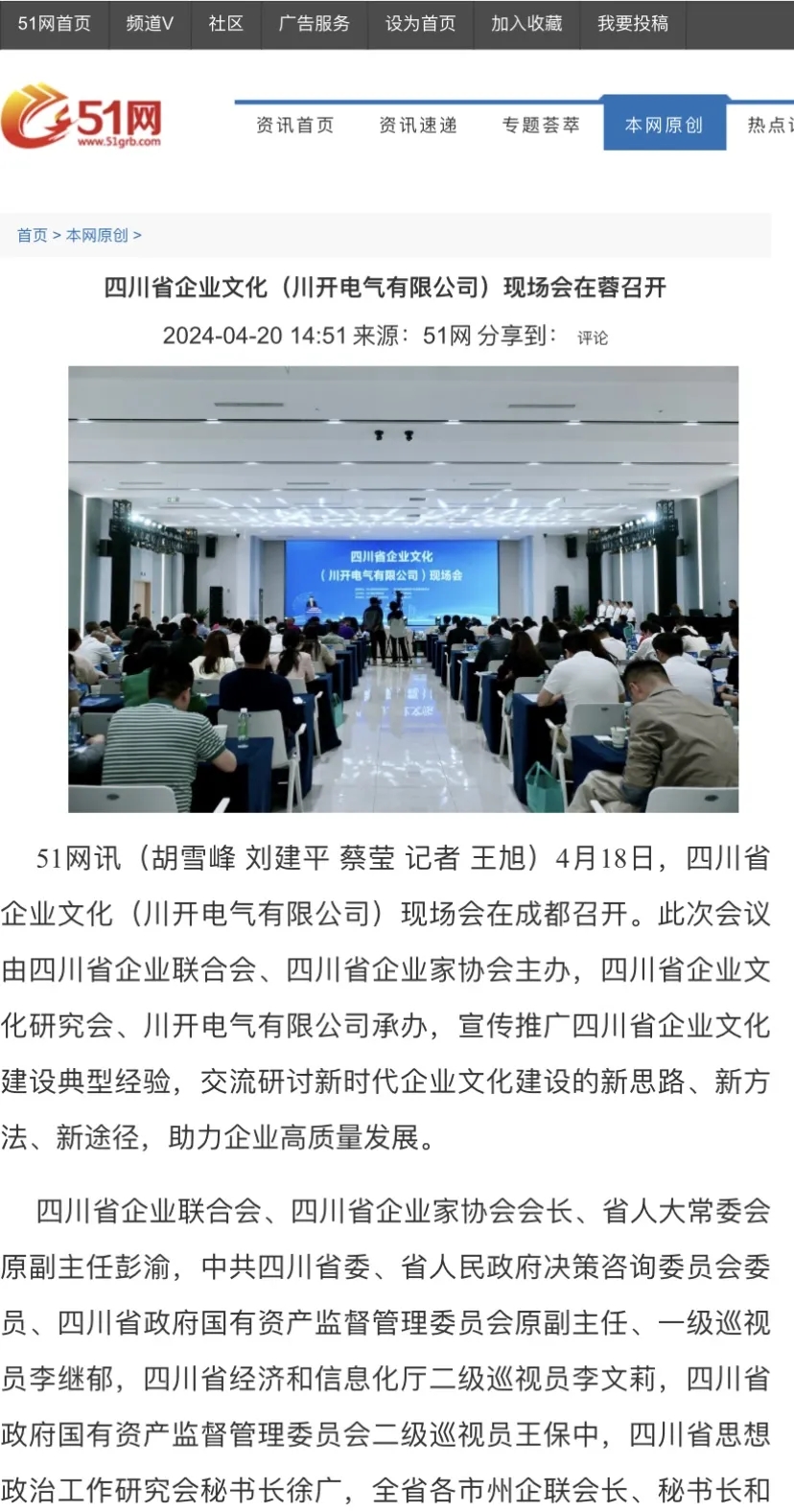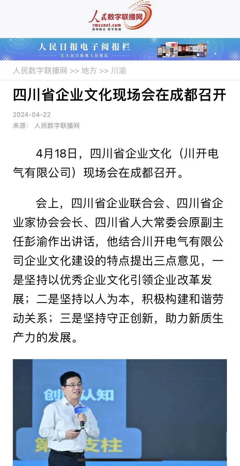 作为推进四川省企业文化建设与企业高质量发展盛会,4月18日,四川省企业文化(川开电气有限公司)现场会成功举行。本次大会吸引了全国多家主流媒体宣传报道,聚焦推广四川企业文化“优秀样板”,取得了影响范围广、传播热度高等成效。