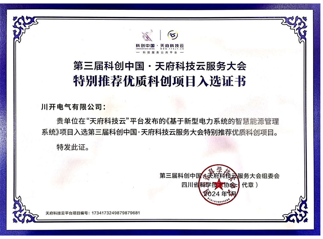 1月18日,为深入贯彻习近平总书记来川视察作出的“在推进科技创新和科技成果转化上同时发力”的重要指示,以实际行动落实中央经济工作会议和省委经济工作会议决策部署,组织广大科技工作者投身科技创新引领现代化产业体系建设,由省科协、省委组织部(省委人才办)等24家省直部门,民盟四川省委、农工党四川省委、九三学社四川省委3个民主党派,并联合四川大学、中科院成都分院等24家重点企事业单位共同举办的第三届科创中国·天府科技云服务大会在成都天府国际会议中心盛大启幕。经九三学社四川省委员会推荐,特锐德川开电气“基于新型电力系统的智慧能源管理系统”作为重大科技成果待转化项目,于第三届“科创会”开幕式现场正式发布。