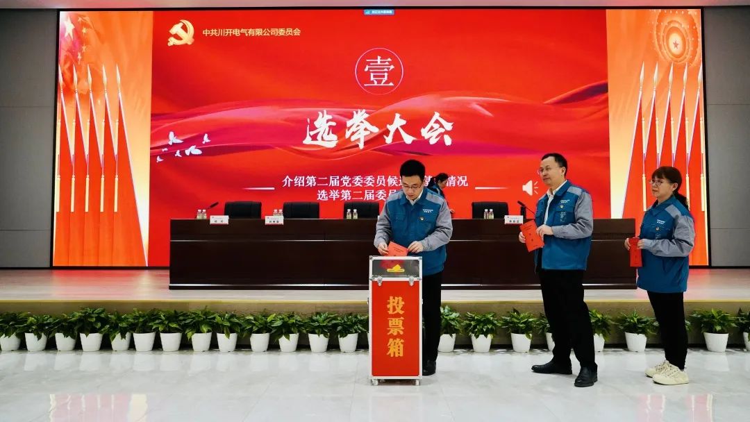 西南航空港经济开发区管委会四级调研员黄为宣读了同意特锐德川开电气党委换届选举的批复。会议通过了大会选举办法与监票人、计票人名单,现场选举了中共川开电气有限公司第二届委员会书记邢志刚、副书记杨莉、鲜坤城。