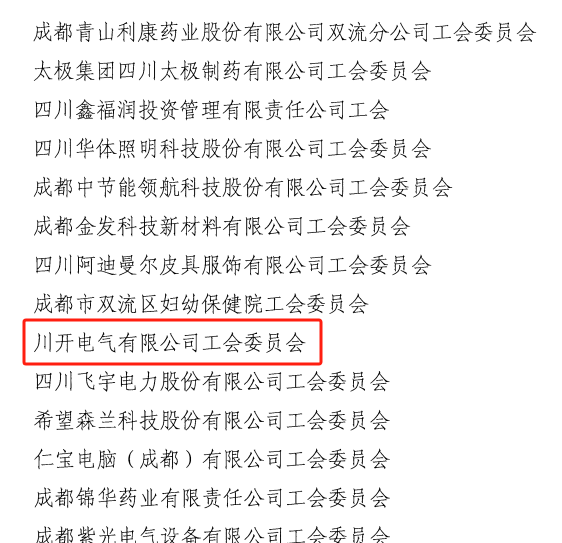 近日,成都市总工会通报了2023年四、五星级企事业单位工会和四、五级镇(街道)、产业园区工会评定结果,川开电气有限公司工会委员会通过了2023年成都市五星工会评定,光荣入选五星级最高级别企事业工会名单。