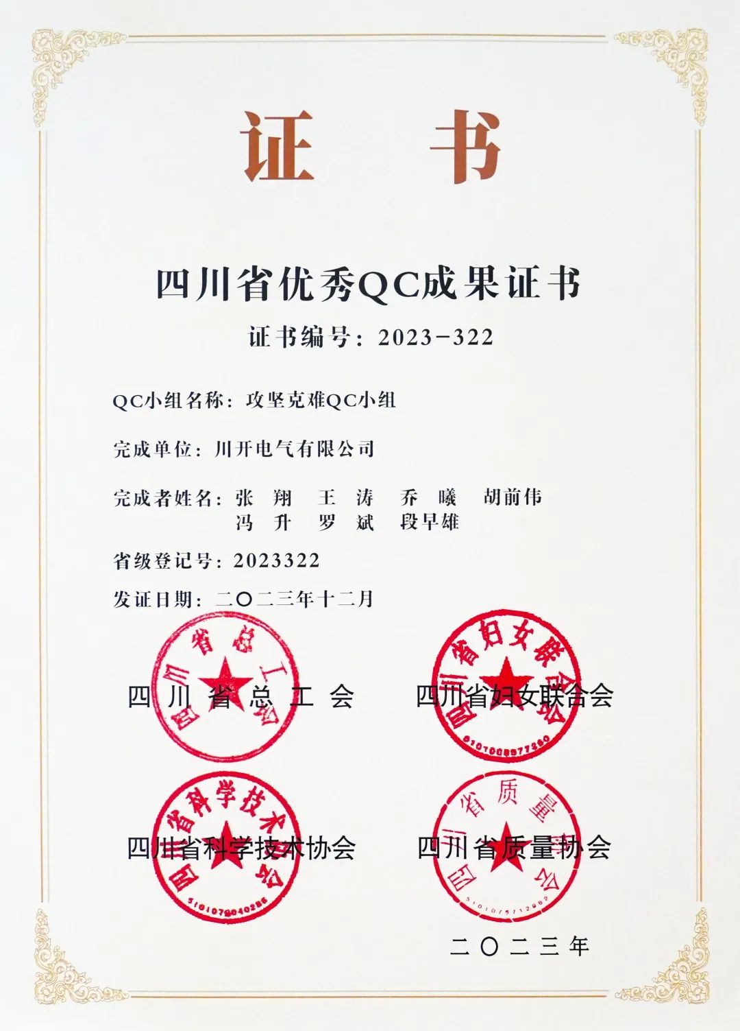 通过本次QC活动,着力解决了互感器、电缆安装困难等痛点难题,大幅度提高工作效率,极大地提升了用户现场安装体验,并稳步提高了人员的标准化意识与技术质量问题综合解决能力。此次证书的荣获,标志着对特锐德川开电气技术攻关能力的认可,同时代表着特锐德川开电气聚焦产品质量,以高效具体的行动持续优化产品方案与细节,充分展现行业领先、品质过硬的核心竞争力。