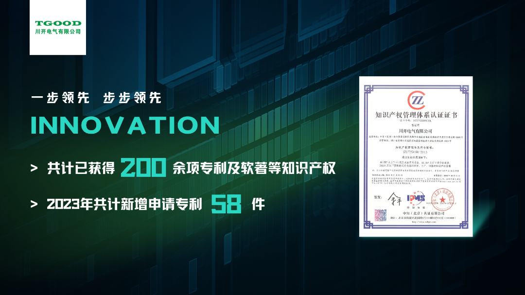 作为国家知识产权优势企业,特锐德川开电气始终坚持以科技创新为引领,建立“一步领先、步步领先”的创新战略体系,在技术研发方面奠定了斐然成就。截止目前,特锐德川开电气共计已获得200余项专利及软著等知识产权,2023年通过预装式变电站、智能开关柜等产品的技术创新共计新增申请专利58件,获得授权29件,其中新增发明专利4件。