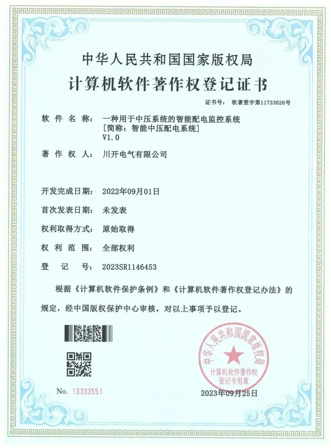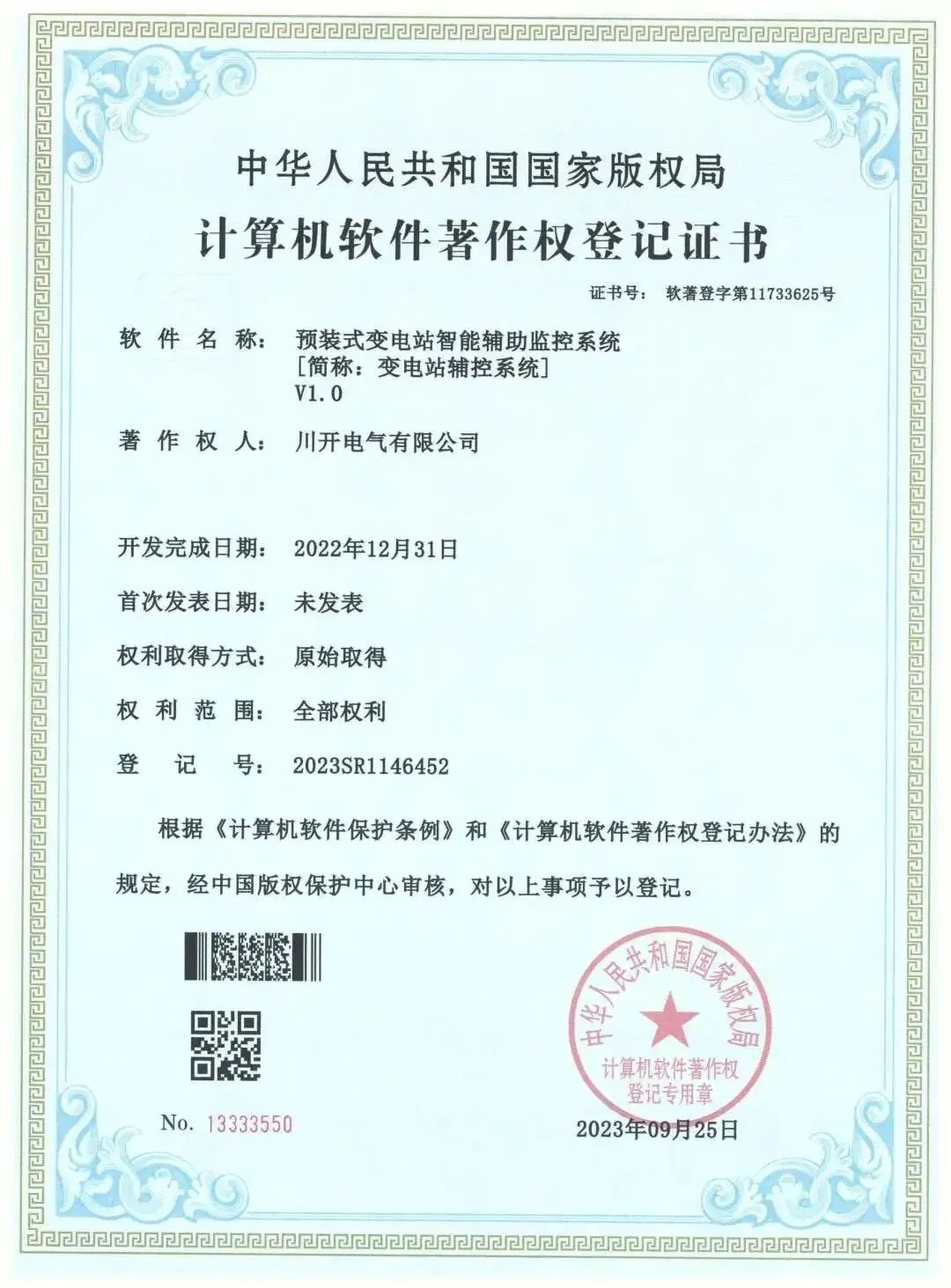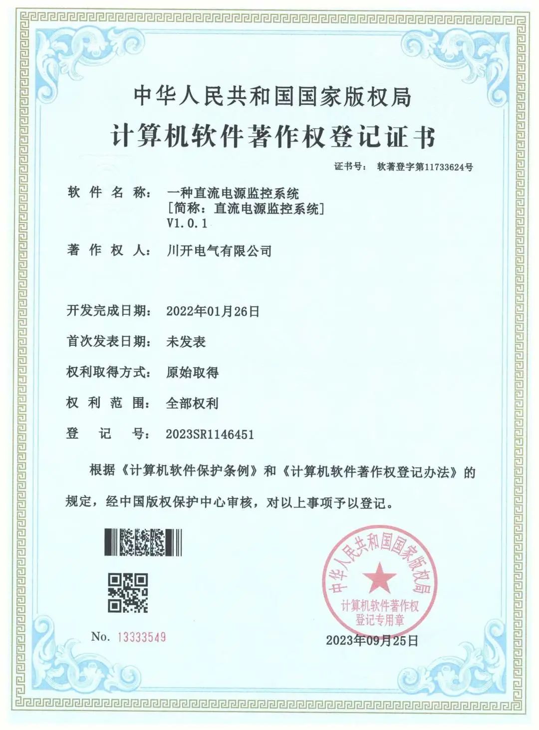 近日,特锐德川开电气荣获预装式变电站智能辅助监控系统、一种用于中压系统的智能配电监控系统、一种直流电源监控系统三项计算机软件著作权登记证书。