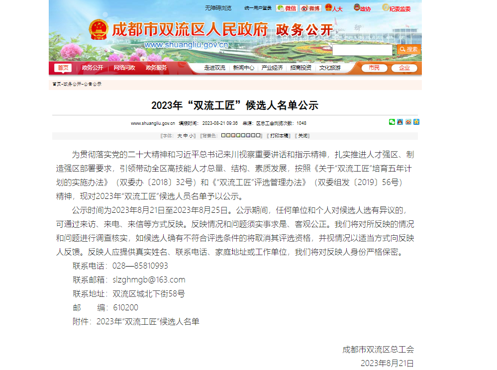 为贯彻落实党的二十大精神和习近平总书记来川视察重要讲话和指示精神,扎实推进人才强区、制造强区部署要求,引领带动全区高技能人才总量、结构、素质发展,成都市双流区总工会公示了2023年“双流工匠”候选人员名单,其中,特锐德川开电气三名职工光荣入选。