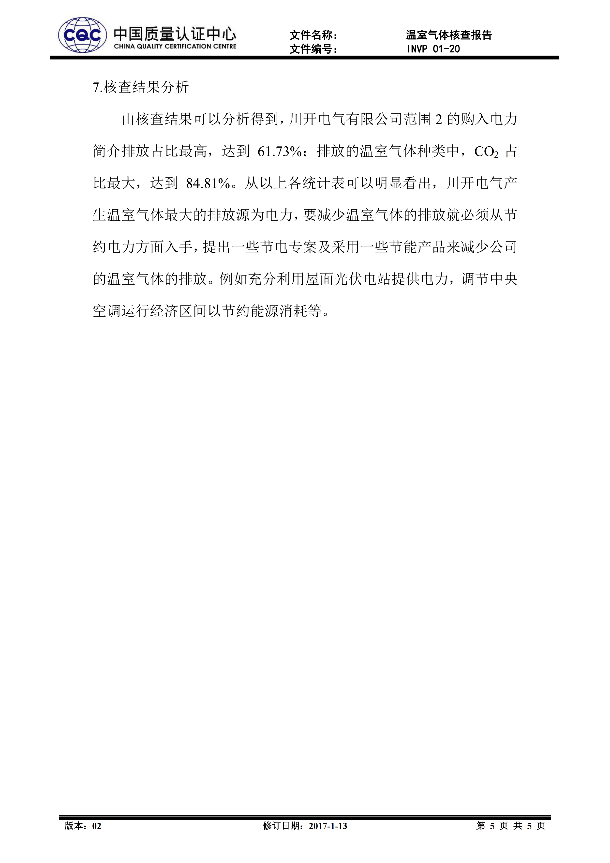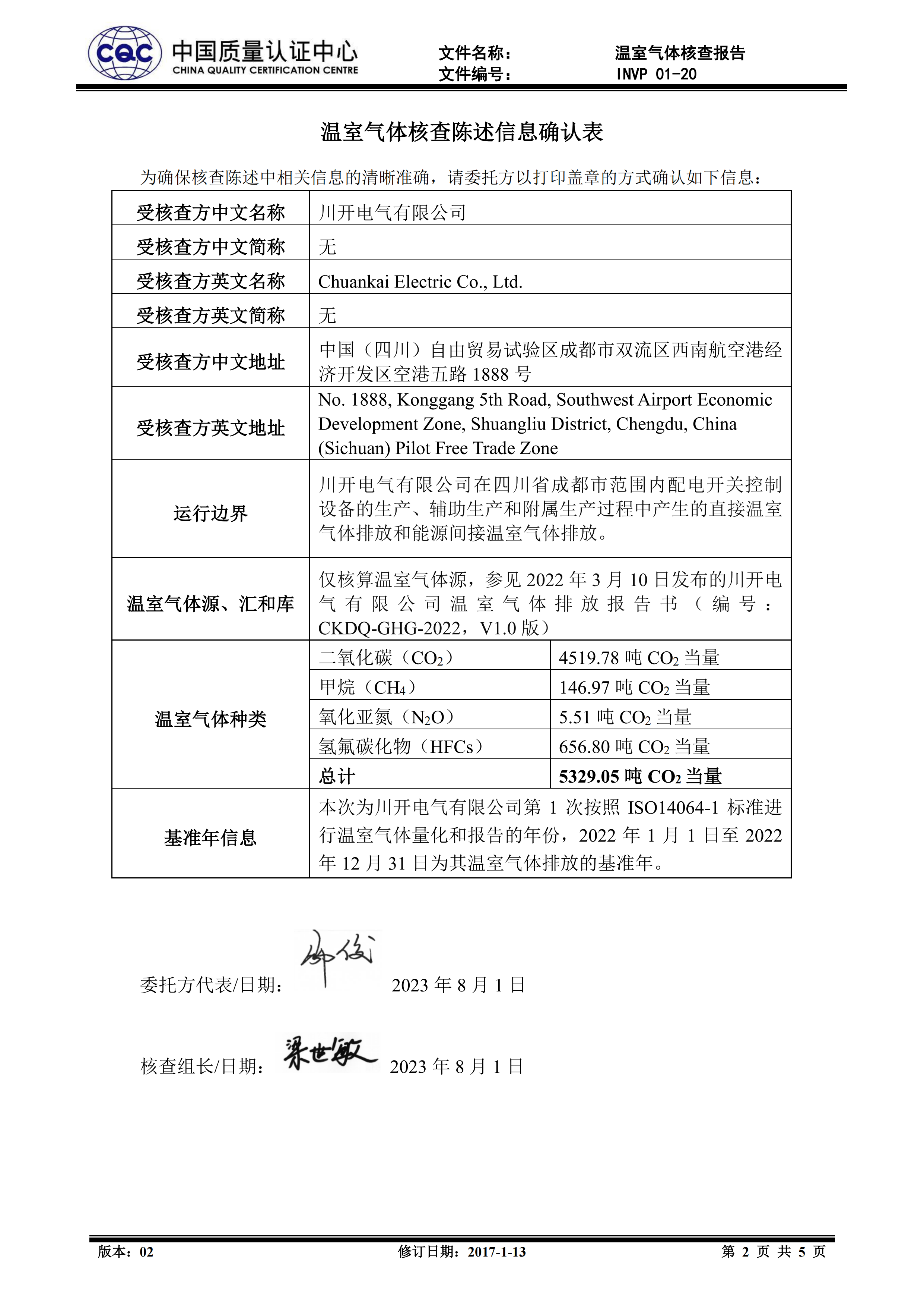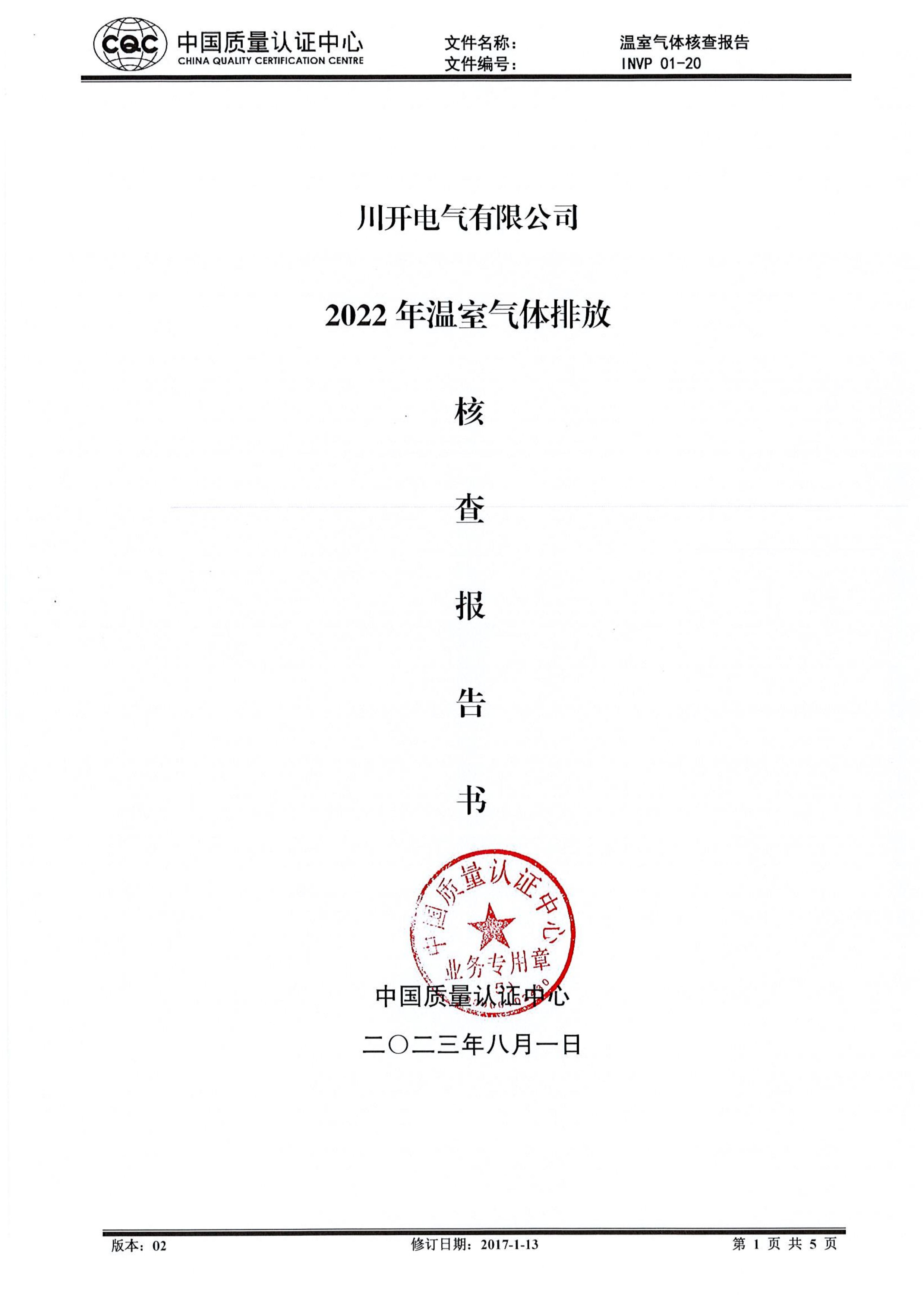 川开电气有限公司获得2022年第三方中国质量认证中心出具的温室气体核查报告,经核证后工厂2022年温室气体排放总量为5329.05吨CO2当量,现予以公示,详情请见附件。