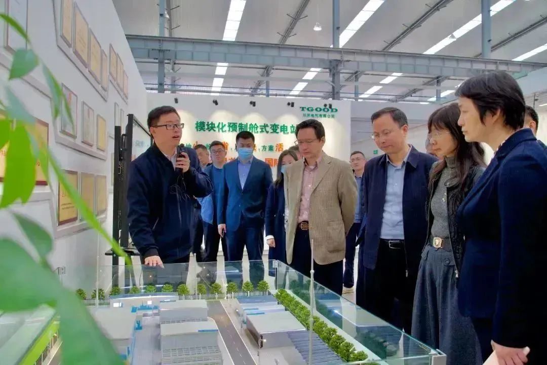 调研团队参观了特锐德川开电气智慧工厂,重点了解了公司核心产品预制舱模块化变电站和智慧能源管理系统,副董事长邢志刚就公司目前的经营情况、科研进展和创新成果等情况进行了详细的介绍。