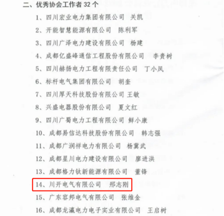 近日,成都电力行业协会第二届理事会第六次会议召开,会上公布了2022年优秀协会工作者名单,川开电气副董事长邢志刚位列其中。