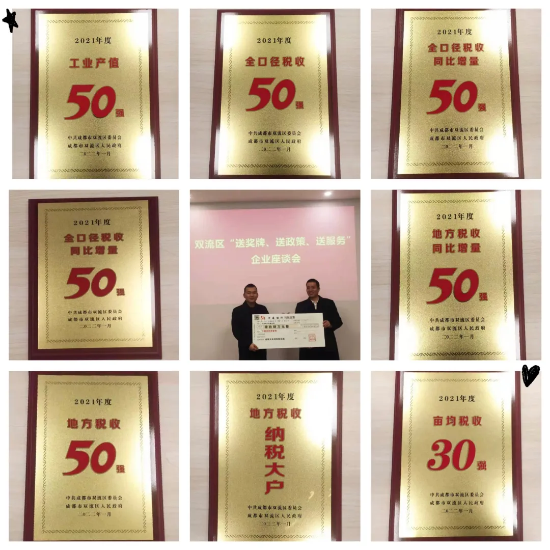 区政协主席唐劲松现场授予川开电气“2021年度亩均税收30强”、“2021年度工业产值50强”、“2021年度地方税收增量50强”、“2021年度地方税收50强”、“2021年度地方税收纳税大户”、“2021年度全口径税收增量50强”、“2021年度全口径税收50强”及“六稳”突出贡献奖。