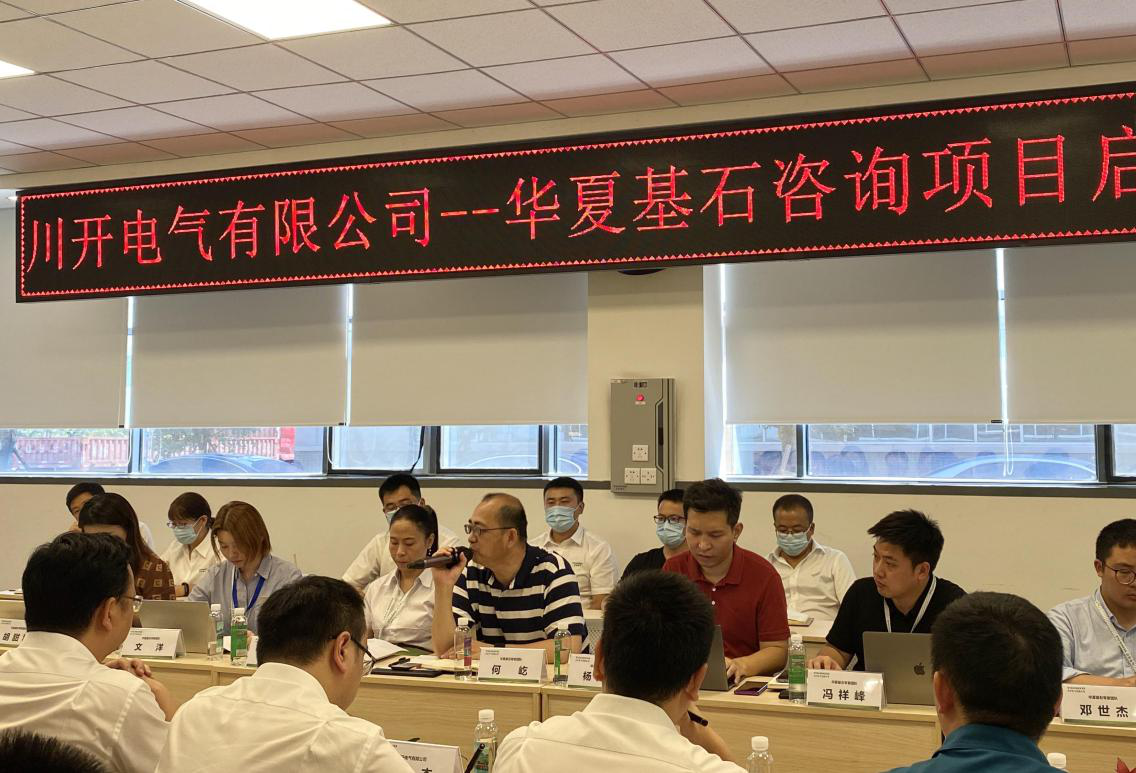 紧接着华夏基石产业服务集团联合创始人何屹作了讲话,他讲到,川开电气在快速发展的道路上,必须在销售收入、内部机制建设、团队建设有所突破,需要建立一支基于未来成长的高绩效团队,同时提出希望华夏基石与川开电气进行陪伴式的合作,一是实现两个转换:即川开电气的动能转换以及团队和人才的结构转型,培养复合型人才与产业链人才。二是表达了所有项目人员并肩战斗、共同努力,全心全力投入到项目建设中的决心以及为客户创造价值,与客户共同成长的建设理念。