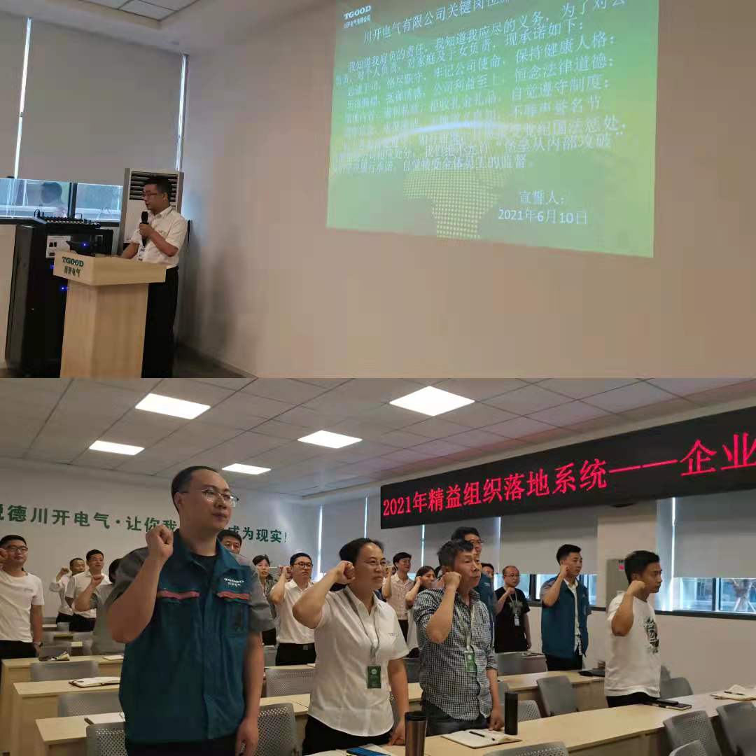 会议共分为四项内容:首先行政管理部经理鲜坤城向参会的战友们传达了集团公司关于供应商违反廉政协议的处理通报,并要求大家以此为戒,筑牢廉洁从业思想防线。随后带领参会全体战友庄重的进行川开电气有限公司关键岗位廉洁从业宣誓。