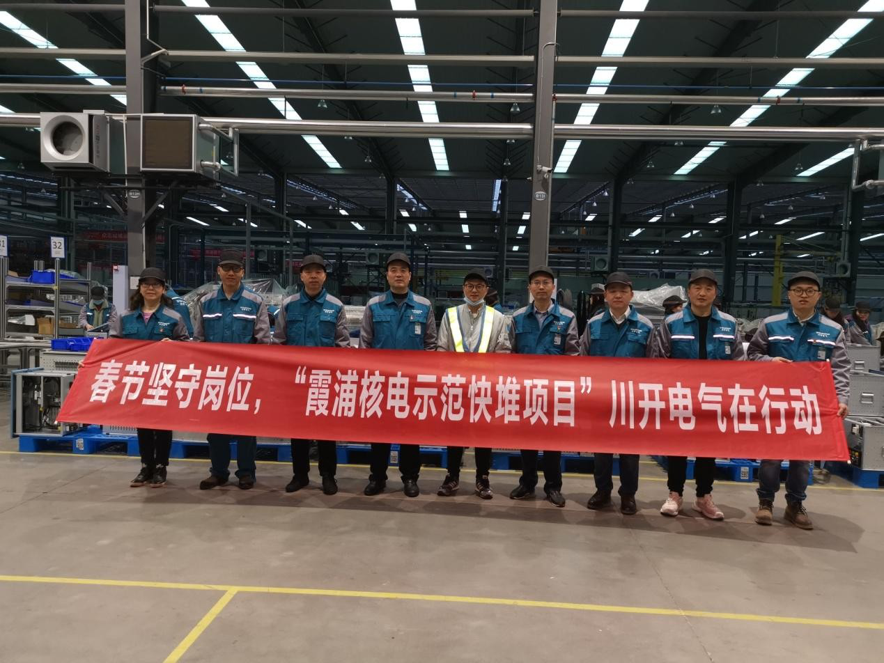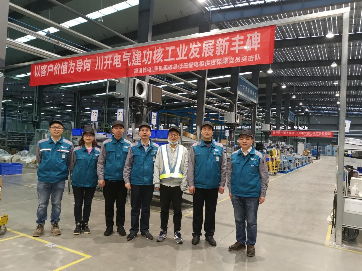 霞浦核电示范快堆工程是我国核能战略“三步走”的关键环节,也是新时代、新形势下中国核工业发展的标志性工程。我公司承制的示范快堆核级和非核级低压交流配电柜项目设计任务重、制造工期紧,其按期、保质、保量供货直接关系到示范快堆现场施工工作的进程。因前期技术接口占用大量时间,后续制造周期非常紧张。为全力追赶进度,公司技术、生产、供应链、质量中心各方积极配合、协同发力,确保项目快速高效推进,先后已有165台低压配电设备陆续发往现场,但仍有159台设备是急需发往现场的。为此,中核霞浦核电设备有限公司设备采购处与川开电气成立了1号机组核岛低压配电柜供货保障党员突击队。在辛丑牛年春节期间开始了生产保卫战