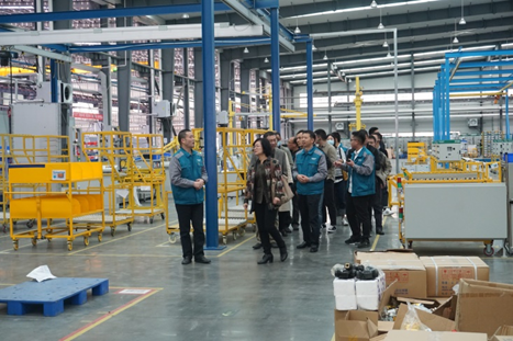 考察组一行详细先后参观了KYN37B生产区、TGS40.5kV产线、充气柜产线、KYN28产线、二次下线、机器人折叠、普玛宝柔性加工区、综合能源管理系统展示等区域。