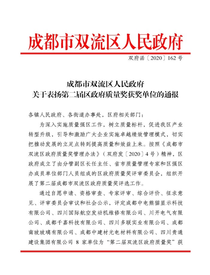 日前,川开电气有限公司荣获第二届双流区政府质量奖。