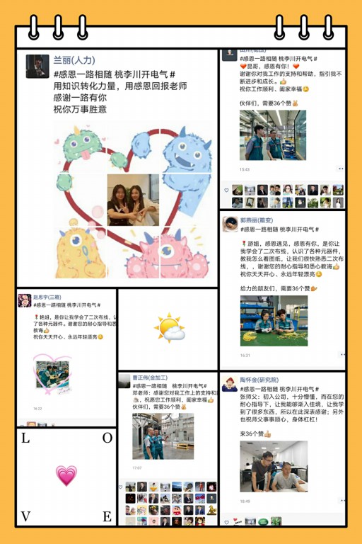 三人行必有我师焉,尊敬师长是中华民族的传统美德。在川开电气,我们有完整的内训师体系,有完善的师徒帮带管理办法。为使徒弟迅速成长,胜任工作岗位,每位师父倾囊相授,亲手指导工作。他们诲人不倦的精神,更加值得我们去学习、去感恩。通过在朋友圈发布师徒合照和祝福话语,获得集赞数后共赢奖品的形式,希望各位战友能敞开心扉,向师傅表达感恩之情。