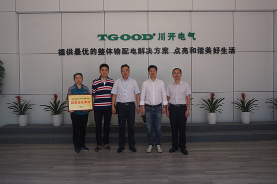 2020年8月26日,成都青岛商会会长马天琛及执行秘书长方渝到川开电气举行成都青岛商会联席会长单位授牌仪式,川开电气有限公司董事长李军、总经理邢志刚、副总经理杨莉、行政部经理鲜坤城参加。