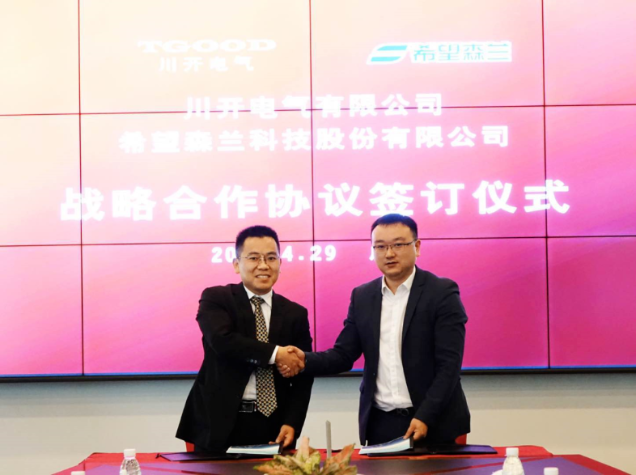 4月29日,川开电气有限公司和大陆希望集团旗下希望森兰科技股份有限公司签署战略合作协议,双方将会在“企业文化与管理经验交流、市场资源整合、共同开发市场、 岸电系统/高低压变频设备开发、 配套产品生产及生命周期服务、 跨界营销合作”等领域展开深度合作