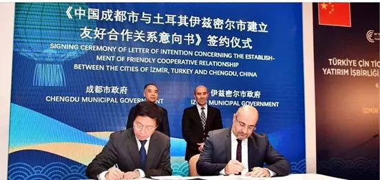 9月6日,在中国-土耳其贸易投资合作论坛上,中国、土耳其两国政商界人士以及赴土参加博览会的其他国家政府及企业代表们,就共建“一带一路”倡议、两国经贸发展前景、投资政策和环境、基础设施建设、能源、科技等各方面的合作进行广泛交流,会上,成都市政府与伊兹密尔市政府签署《中国成都市与土耳其伊兹密尔市建立友好合作关系意向书》。