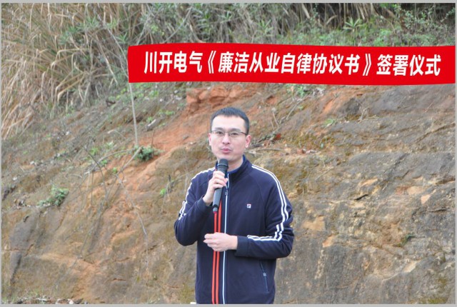 川开电气常务副总经理李广智在廉洁协议签署前讲话,强调本次廉洁协议的签署旨在为公司的健康发展,共建公平、诚信、稳定的对外合作关系立规明矩。同时要求各位战友在工作中相互监督。监督不是找别人的茬子,而是对同事最好的帮助;不是给别人找麻烦,而是对同事最大的爱护;不是多管闲事,而是不可缺少的保护。监督犹如“啄木鸟”,只要发现别人有缺点毛病,就要及时提醒、帮助,治病于未发之前,防止由小过铸成大错。公司要全面贯彻公正精神,深入推进廉洁建设。各级干部要率先垂范,严格履责,本着对自己负责、对家庭负责、对团队负责。