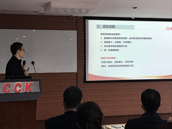 首先,采购管理部部长薛彦聪分析了推行寄售后可做出的改善点,同时提出,采购管理部将以寄售为开端,结合公司实情,不断深入,优化我司供应链管理,包括后续的VMI模式推广,打造供应链管理体系等等。并引用例案讲解开展寄售后可取得的预见性成果,其中包括方便生产,缩短供应半径,节约流通费用;降低库存,减少资金占用;节约采购资金;引进竞争机制,有利于保证物资质量,提高服务水平等。
