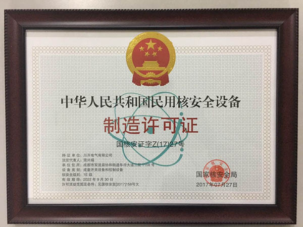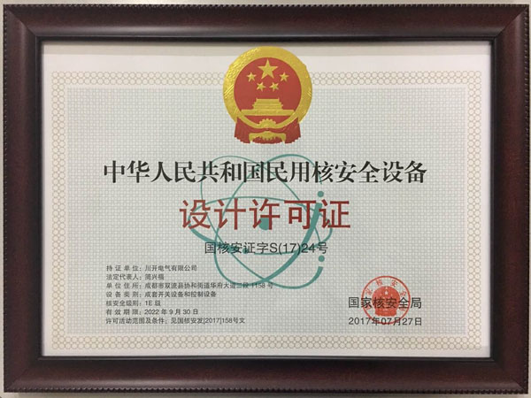 2017年10月16日,川开电气有限公司正式获颁《民用核安全设备设计许可证》及《民用核安全设备制造许可证》。