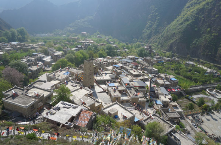 23日上午我们从理县出发赶往甘堡藏寨。甘堡藏寨是“嘉绒藏区第一寨”。同行的人们纷纷推动转经筒为家人祈福。从日月广场往前走,直到屯兵广场和点将台,拾梯而上,远远地就能看到墙上有一幅巨大的格萨尔王彩绘,寨子后山上经塔伫立,各色的经幡随微风扬起,顺山势而下,绮丽而又壮观,让人流连忘返。