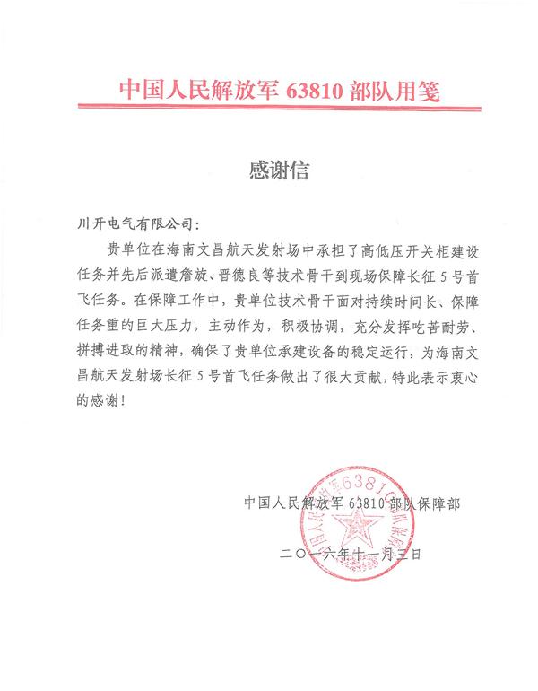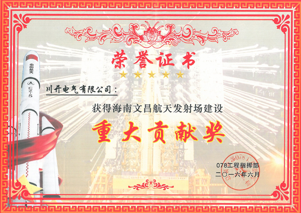 长征五号发射成功不久后,我公司便收到了中国人民解放军078工程指挥部办颁发的海南文昌航天发射场建设重大贡献奖以及63810部队寄来的感谢信,向我公司多年来对长征五号火箭所做的保障供电工作和对中国航天事业的大力支持表示衷心的感谢和崇高的敬意。