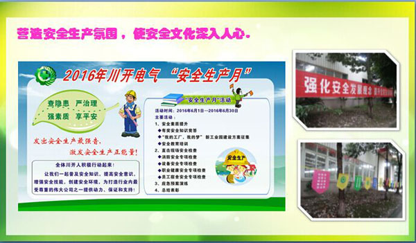 以“查隐患 严治理 强素质 享平安”为主题的川开电气第6届安全月活动,在活动领导小组的带领下,各活动小组围绕活动主题,组织实施了各专题活动。活动于6月30日划上了圆满的句号。通过为期一个月活动的开展,全员普及了安全知识,提高了安全意识,增强了安全技能。达到了活动的目的——发出安全生产最强音 激发安全生产正能量。