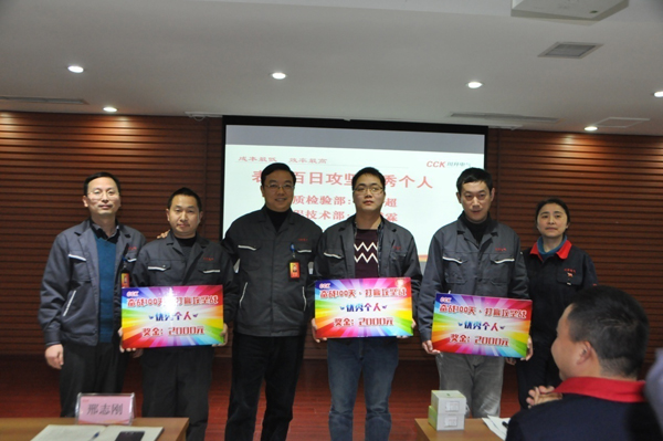 总结议程告一段落之后,会议进入第二个重要部分——表彰环节,以“奋战100天,打赢攻坚战”为主题的百日会战从2015年10月份持续到2015年12月,这也是川开电气史无前例的一次持续时间最长、参与面积最广的生产大会战。经过三个月的激烈角逐,最终评比出了此次百日攻坚战的优秀团队和优秀个人。来自装配车间的周先芬组以明显的优势摘得优秀团队桂冠。获得优秀个人的分别是:工程技术部黄曦霖、中低压部柜体车间杨兴勇和品质检验部刘超,他们是奋进川开人中的一小部分,却折射出了川开电气拼搏向上的企业之魂。