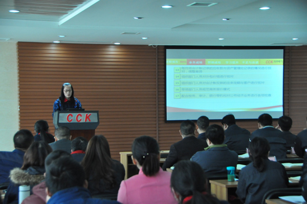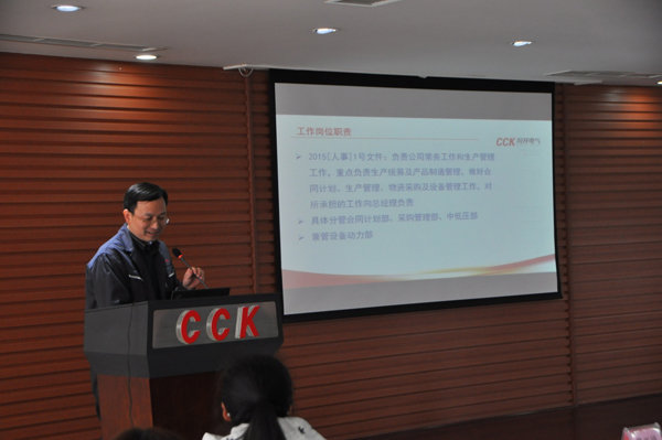 简董致辞之后,会议正式开始。川开电气有限公司高、中层干部依次开展2015年工作总结报告,结合本职工作,从2015年工作亮点、不足,以及对2016年的工作计划三个方面进行了个人及所在部门的深度剖析和总结。