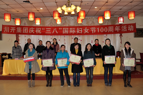 会议首先由简兴福董事长首先向全体女员工们表示节日祝福,充分肯定了女员工们为企业发展做出的努力和贡献并提出新的希望。女工委员会主任赵玲作专题发言激励全体女员工要自立、自信、自强,充分发挥“半边天”的作用。李会春副主任作《2009年度集团公司妇女工作总结》。我公司陶厚珍等15名女员工荣获“川开集团2009年度女标兵”称号并受到表彰,集团总裁王洪先生号召全体女员工以标兵和先进为楷模,爱岗敬业,为公司发展做出新的更大贡献。