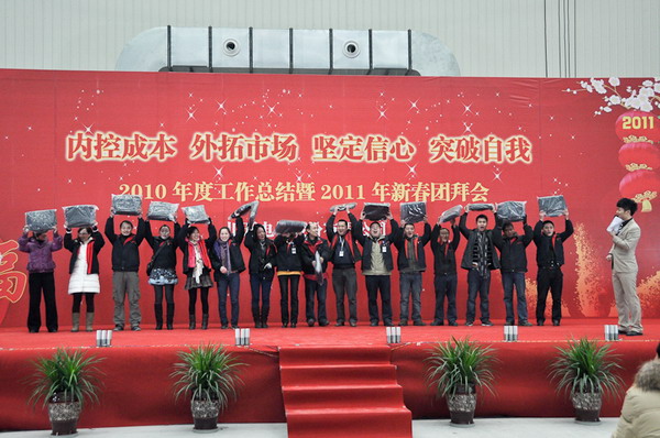 2011年1月29日上午9:00时,以“内控成本、外拓市场、坚定信心、突破自我”为主题的“2010年度工作总结暨2011新春团拜会”隆重拉开序幕。集团领导、兄弟单位来宾、全体员工及家属代表们等千余人欢聚一堂,共迎新春。