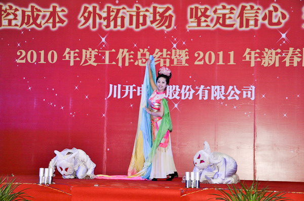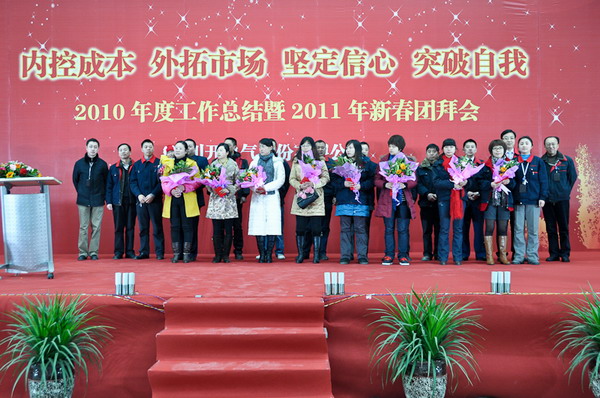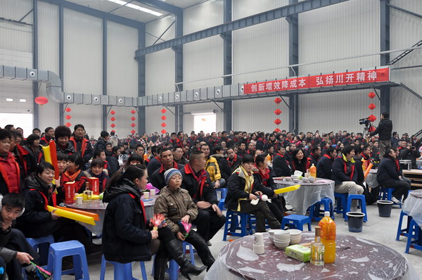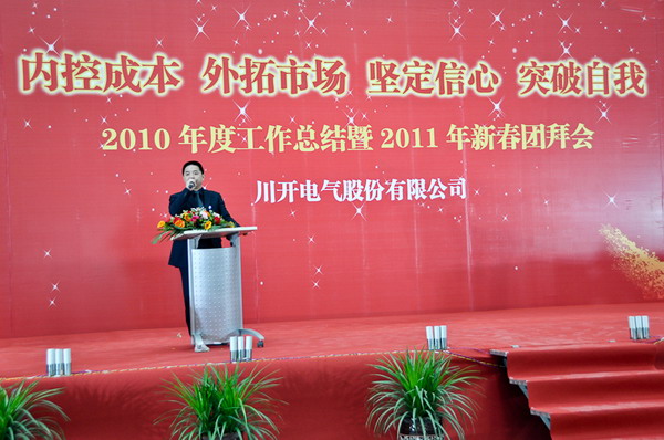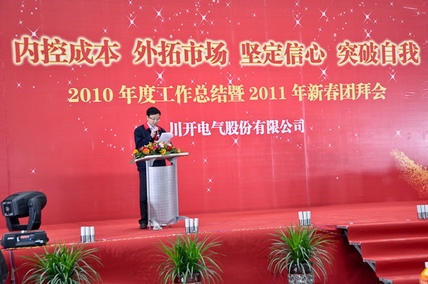 简兴福董事长首先代表集团公司董事会向在场人员表达新春祝福!王洪、袁会云等领导发表了热情洋溢的新春致辞。公司总经理李军对2010年工作进行总结,并对2011年工作进行整体安排及部署。常务副总马力代表公司对职工家属们及供应商的到来表示欢迎及感谢,希望在新的一年里大家能够一如既往地支持我们,共创川开美好明天。会上还对2010年度先进工作者进行了表彰。