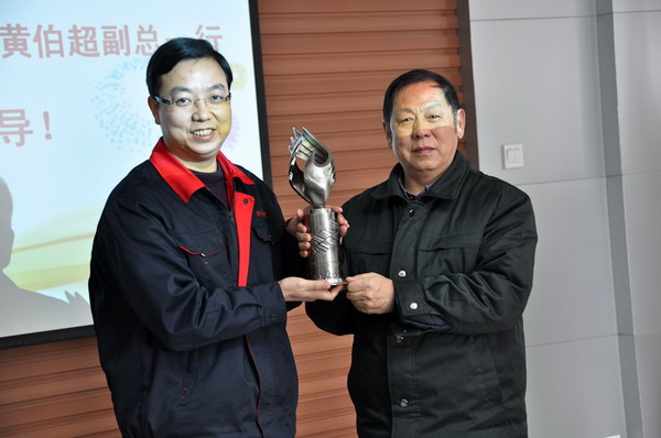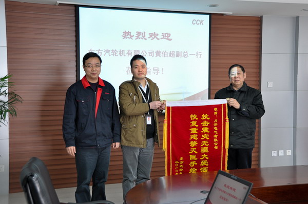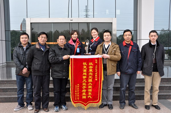 最后,黄伯超副总代表东汽公司授予我公司“抗击震灾无疆大爱洒东汽、恢复重建擎天巨手绘蓝图”的旗帜以及象征友好互助的纪念杯,双方合影留恋。我公司与东汽将携手并进,共同承担起国家建设发展重任,为推进国家环境建设和可持续发展贡献力量。