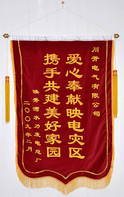 2009年1月19日,公司组织人员前往映秀湾电厂,除了提供技术服务支持外,还为映秀湾电厂提供了10万元捐款,以点滴心意援助映秀湾电厂恢复发电。此举得到了映秀湾电厂高度赞扬,一副“爱心奉献映电灾区 携手共建美好家园”的锦旗表达了映秀湾电厂对川开电气的深深谢意。