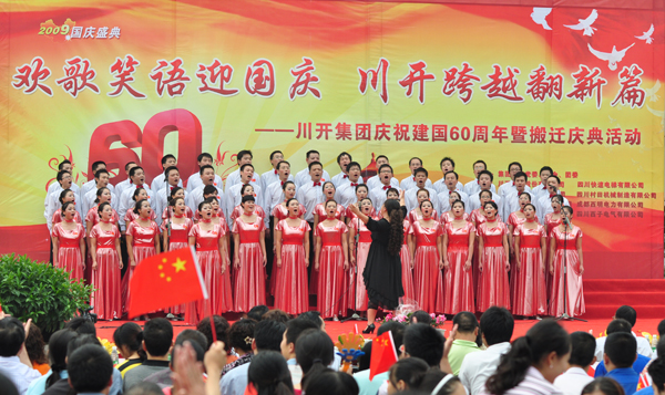 60年风雨兼程,60年激情跨越。川开电气在庆祝中华人民共和国成立60周年之际,9月30日,参加了集团举办的以“载歌载舞迎国庆 川开跨越翻新篇”为主题的国庆歌咏比赛,数百余名职工登台演唱,川开人用激情四溢、雄壮嘹亮的歌声唱出对伟大祖国的祝福,对企业的信心以及对幸福生活的赞美,以自己独特的方式为祖国的生日献上贺礼。